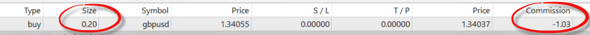 Ora prendiamo un’operazione equivalente sempre su GBPUSD e con la stessa size 0.20 effettuata con il nostro broker partner. Le commissioni mostrate sono 1.03 EUR. A parità di setup, rischio e gestione della posizione il solo cambio di struttura commissoniale riduce lo scarto iniziale da colmare per andare in profitto.